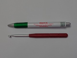 A horgolótű alumínium ötvözet, műanyag fogóval. A fém rész átmérője: 6 mm. Az egész horgolótű hossza: 14 cm.