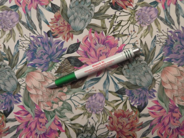 Digitálisan nyomott 100% okö pamut puplin, fehér alapon lila-mályva virágos mintával.