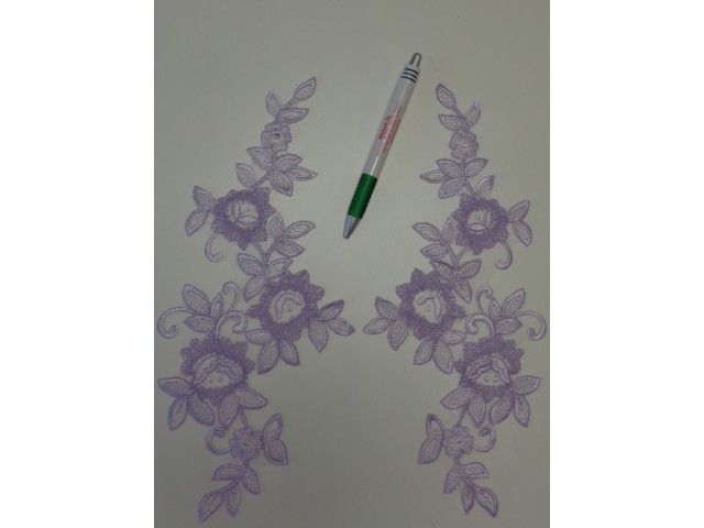 Lila színű páros csipke. Mérete:31 x 12 cm. Egy jobbos és egy balos csipke alkot egy párt.