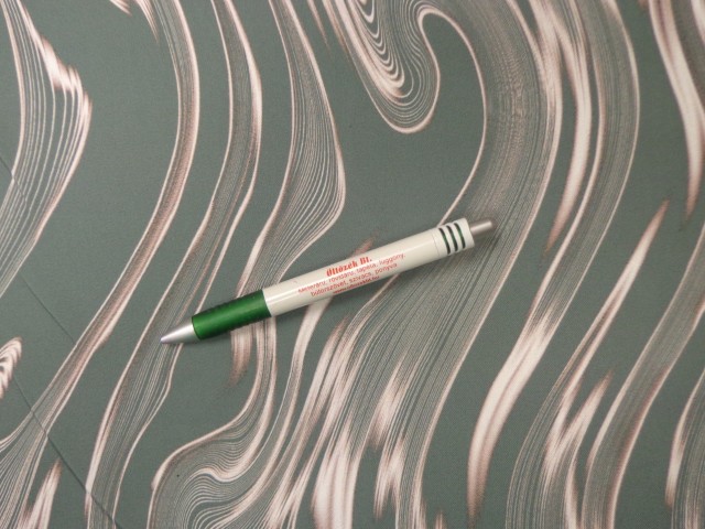 Szürkés-zöld alapon ekrü hullámos, mintás, vékony, könnyű "Latina" anyag.